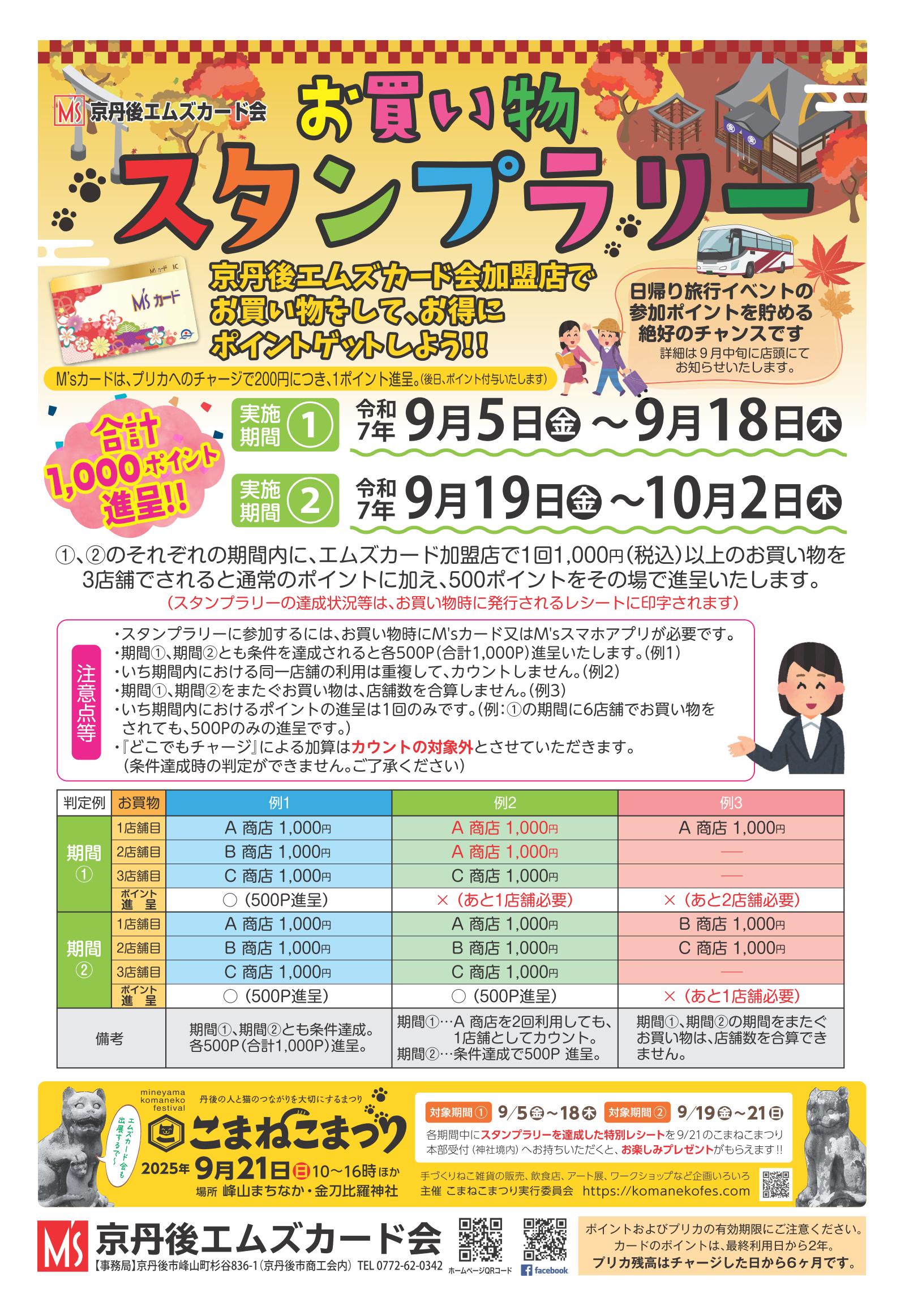 期間①、期間②の期間中にスタンプラリーを達成した特別レシート【条件達成】レシートを9/21(日)のこまねこまつり本部受付(神社境内)へお持ちいただくと、お楽しみプレゼントがもらえます。(粗品との引き換えは9/21の開催中のみ有効です。ご注意ください。)